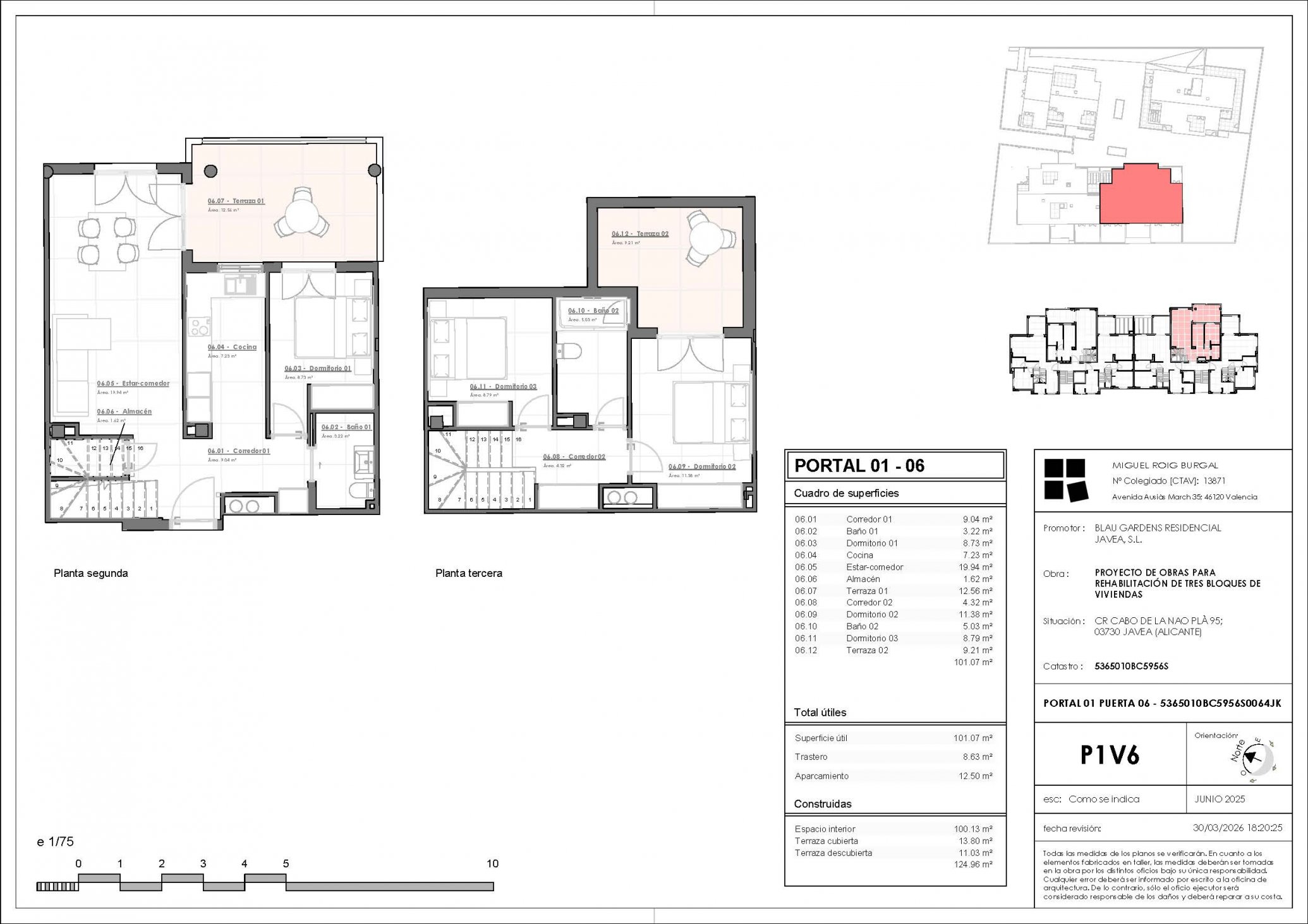 Vivienda dúplex ubicada en la planta 2 que cuenta con una superficie de 124,96 metros construidos, ditribuidos en 3 dormitorios, 2 cuartos de baño, salón comedor y cocina. Dispone de 2 amplias terrazas. Plaza de garaje y trastero incluido en el precio.