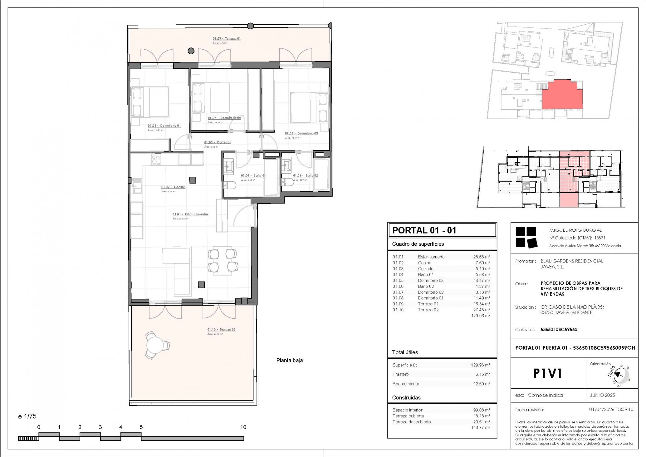 Vivienda ubicada en la planta baja que cuenta con una superficie de 136,33 metros construidos, ditribuidos en 3 dormitorios, 2 cuartos de baño, salón comedor y cocina. Dispone de 2 amplias terrazas. Plaza de garaje y trastero incluido en el precio.
