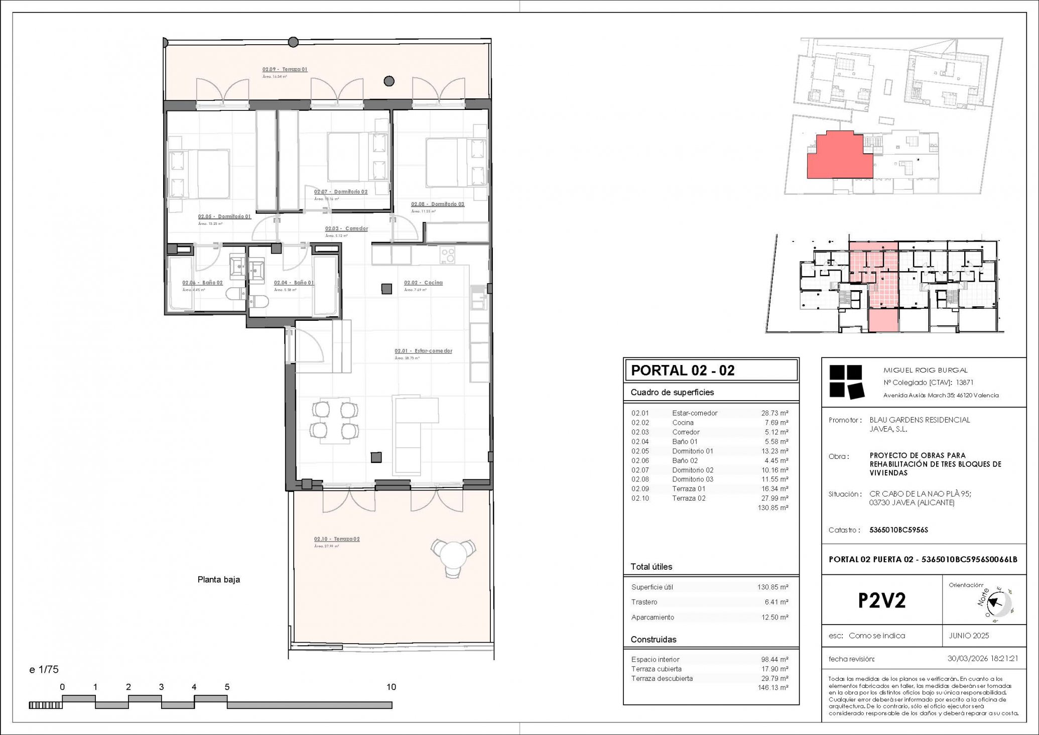 Vivienda ubicada en la planta baja que cuenta con una superficie de 135,91 metros construidos, ditribuidos en 3 dormitorios, 2 cuartos de baño, salón comedor y cocina. Dispone de 2 amplias terrazas. Plaza de garaje y trastero incluido en el precio.